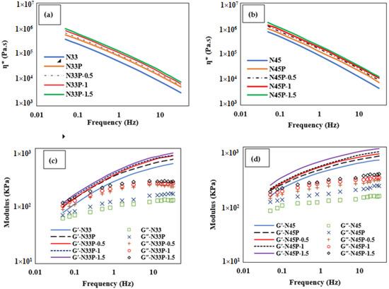 As shown in Figure 4a,b, ŋ* increases when increasing the content of nanoparticles because of the interaction enhancement between the OMMT nanoparticles and the matrix. At higher frequencies, the shear rate increases, leading to the disentanglement of the chains, weakening of matrix/nanoparticle interactions, and a significant decrease in the complex viscosity. In N33P and N45P samples, when the amount of OMMT nanoparticles increases to 1.5 phr, the viscosity increases by around 55% and 60%, respectively. The higher viscosity of the samples with higher acrylonitrile content results from the polar nature of OMMT nanoparticles.