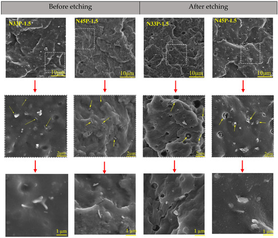 To study the OMMT distribution, the FESEM analysis was used for the samples containing 1.5 phr nanoparticles before and after etching (Figure 5). As shown in the figure, good dispersion of the phenolic phase in the NBR phase is observed, which shows that the two polymers are highly compatible with each other. Nanocomposites that have a higher acrylonitrile percentage have more finely dispersed phase particles. In other words, higher polarity has caused a better interaction with the phenolic phase, resulting in improved compatibility. The presence of nanoparticles is shown with arrows in the figure. It is clear that OMMT nanoparticles are well dispersed in the matrix, which can lead to the production of nanocomposites with enhanced final properties. After etching, the elimination of the phenolic phase caused the formation of some pores, the size of which varied in different samples. Smaller pores are observed in N45P compared to N33P because of the better compatibility between the phenolic phase and N45 rubber. The incorporation of OMMT nanoparticles has improved the compatibility between the two phases and made the dispersed phase finer. Moreover, the tendency of clay nanoparticles to the phenolic phase (proximity of nanoclay to pores) is due to the polarity of OMMT particles.
