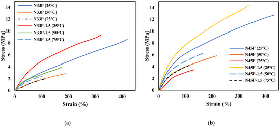 Stress–strain curves at 25, 50, and 75 °C for (a) N33P and N33P-1.5; (b) N45P and N45P-1.5.