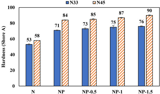 The results of the hardness test are shown in Figure 7. As the figure shows, the stiffness of the rubber has been increased by the addition of phenolics to the NBR due to the increased crosslinking. On the other hand, the hardness increases with the addition of OMMT to the nitrile rubber/phenolic resin blend. Previous reports also showed the hardness increase upon increasing the proportion of nanoparticles [27]. The more difficult penetration of the test indenter into samples containing N45 is due to the higher Mooney viscosity of these samples.