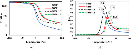 To evaluate the dynamic–mechanical properties of nanocomposites containing 1.5 phr OMMT, the DMTA test was used. Figure 8a shows the storage modulus variation in the temperature range of −100 to 100 °C, and the changes in tan δ () are shown in Figure 8b. According to the results, the blends and nanocomposites have a characteristic peak of Tg, showing the very good compatibility of these two phases, which was also observed in the FESEM images of the samples. Samples containing N45 have a Tg peak at higher temperatures, so N33P and N45P blends have Tg of 6.7 and 19.1 °C, respectively. Increasing the percentage of acrylonitrile in NBR increases the glass transition temperature. In the presence of the polar groups of acrylonitrile, the interaction among polymer chains increases; hence, a higher temperature is needed to make chains move, and therefore Tg increases. On the other hand, increasing the percentage of acrylonitrile has increased G′. The increment in hydrogen bonds in the presence of higher acrylonitrile groups and thereby higher polarity is considered the reason for the increase in G′ [28].
