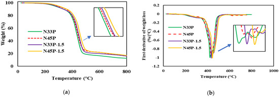 TGA analysis of selected samples, its first derivative, and the decomposition temperature and char residue are given in Figure 9 and Table 5, respectively. According to the figure, all samples show thermal degradation in the temperature range of 300–400 °C because of the breakage of phenolic and NBR chains. N45P has higher thermal stability than does N33P, which is probably due to polar acrylonitrile groups, which cause higher interactions between the polymer phases, leading to their destruction at higher temperatures [31]. By adding OMMT to the blends, degradation occurs at higher temperatures so that the addition of 1.5 phr of OMMT to N33P and N45P increases the thermal degradation temperature by approximately 23.4 and 27.1 °C, respectively. Moreover, by the addition of OMMT nanoparticles, the rate of thermal decomposition is reduced. The reason is that nanoparticles play the role of a physical barrier against the diffusion of small gas molecules upon thermal degradation. When the distribution of nanoparticles is better, the thermal stability of the nanocomposite is higher. Similar results are observed in the exothermic peaks shown in the derivative curve. Additionally, in the presence of nanoparticles, the char residue of nanocomposites has increased [1,32].