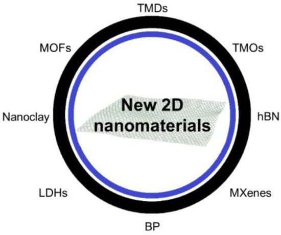 After the upsurge of graphene, one of the most studied 2D nanomaterials for biomedical applications, new and emerging two-dimensional nanomaterials (2DnMat) are becoming part of a fast-growing platform aimed at their research and characterization [1,2,3,4,5]. These new materials succinctly comprise transition metal dichalcogenides (TMDs), transition metal oxides (TMOs), transition metal carbides, nitrides and carbonitrides (MXenes), black phosphorus (BP), layered double hydroxides (LDHs), 2D metal-organic frameworks (MOFs), nanoclay, hexagonal boron nitride (hBN), among others [6,7], as displayed in Figure 1. Similarly to graphene, they have unique properties that distinguish them from their bulk counterparts, such as high surface area, strong covalent bonds within the layer and weak van der Waals bonds between layers, dimensional confinement of electrons, etc. [8]. These make them suitable for a wide range of applications [9] including gas sensing [10,11], energy storage [12,13], water splitting [14,15], optoelectronics [16,17], water filtration [18,19], and diverse biomedical applications [20].