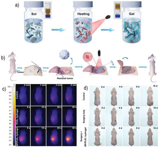(a) Schematic of the BP/PLEL hydrogel gelation triggered by NIR radiation; (b) Schematic illustration of the post-surgical application of the BP/PLEL hydrogel. NIR induces gelation and promotes PTT of residual tumor while providing the site with an antibacterial platform; (c) time dependent thermographic map of the control, pristine PLEL, and BP/PLEL with NIR radiation; (d) photographs of the treatment progress throughout 16 days for control, surgery-only, and surgery + BP/PLEL with NIR hydrogel. No recurrence for the composite. Adapted from [73] © 2018 The Authors. Published by WILEY-VCH Verlag GmbH & Co. KGaA, Weinheim.