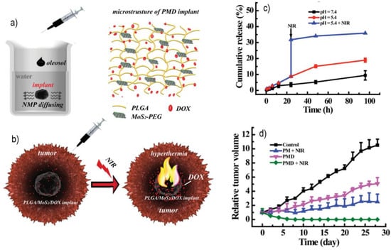 (a) Schematic representation of the solidification process when in contact with water and the microstructure of the implant; (b) diagram of the implant application in vivo, injection of the implant on the tumor which induces tissue hyperthermia upon NIR exposure; (c) DOX release profile under three different conditions (pH = 7.4; pH = 5.4; pH = 5.4 + NIR); (d) tumor volume under different treatments (control; PLGA/MoS2 (PM); PLGA/MoS2/DOX oleosol (PMD); PMD + NIR). Reproduced with permission from [81] © 2015 WILEY-VCH Verlag GmbH & Co. KGaA, Weinheim.