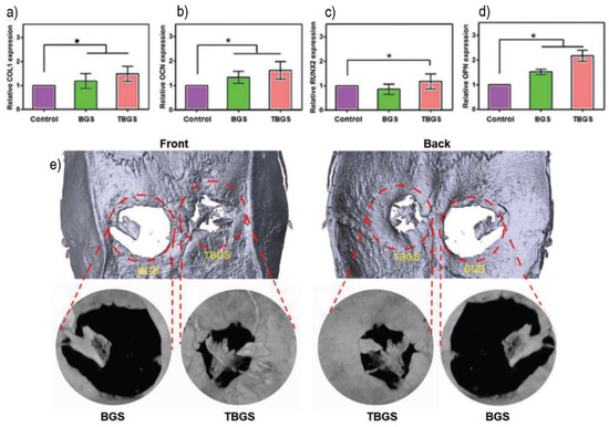 Osteogenic gene expression of (a) COL-1; (b) OCN; (c) RUNX2; (d) OPN in control, bioglass scaffolds (BGS) and BG/Ti3C2 scaffolds (TBGS). * represents a p < 0.05 significance. (e) in vivo osteogenic performance of BGS and TBGS scaffolds at 24 w post-scaffold implantation. Adapted from [92] © 2019 The Authors. Published by WILEY-VCH Verlag GmbH & Co. KGaA, Weinheim.
