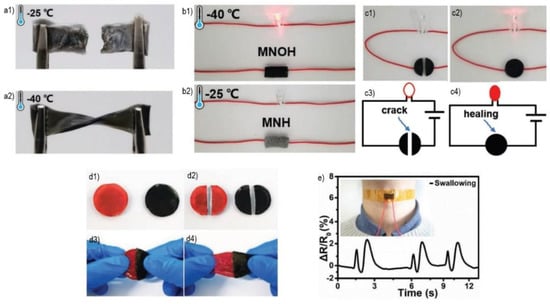 Comprehensive overview of the organohydrogel performance. (a) low temperature behavior of the composite pre-EG (ethylene glycol) (a1) and post-EG (a2); (b) electrical conductivity performance of the organohydrogel at low temperatures post-EG (b1) and pre-EG (b2); (c) conducting performance of the post-EG organohydrogel cut in half (c1), after self-healing (c2), and the corresponding schemes (c3) and (c4) respectively; (d) self-healing behavior of the post-EG organohydrogel. (d1) Two pieces of the hydrogel (black—original; red—dyed with rhodamine B). (d2) Each piece was cut in half. (d3) Self-healed hydrogel with one piece from each (black and red). (d4) Stretching behavior after self-healing; (e) real-time detection of throat swallowing movements. Reproduced with permission from [88] © 2019 WILEY-VCH Verlag GmbH & Co. KGaA, Weinheim.
