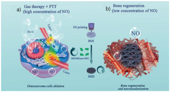 Schematic illustration of the multifunctional therapeutic platform. (a) NO gas release triggered by NIR radiation combined with PTT destroys osteosarcoma cells while (b) slow release of NO post-PTT stimulates bone regeneration. Reproduced with permission from [99] © 2020 WILEY-VCH Verlag GmbH & Co. KGaA, Weinheim.