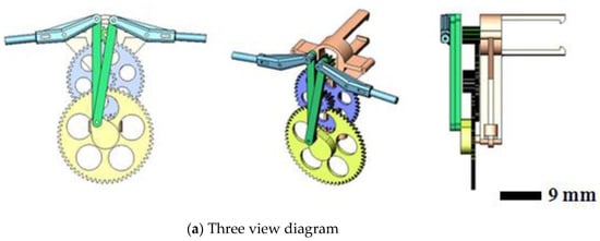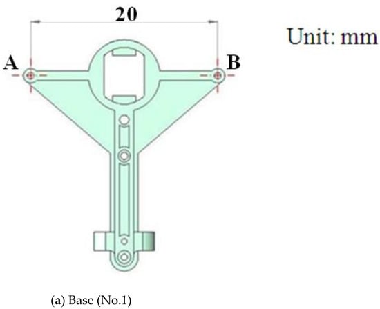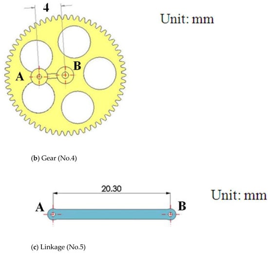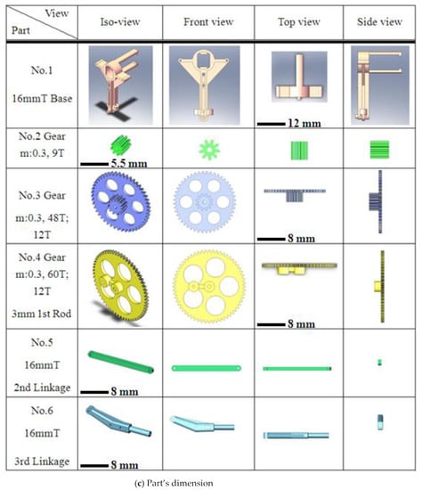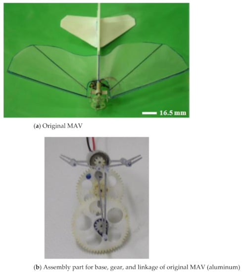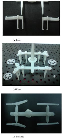 The original MAV and its transmission parts (aluminum, Al 6061, Tripod Aluminum Co., Ltd., Changhua, Taiwan) that were developed by the authors’ lab are shown in Figure 1a,b. The transmission parts of the original MAV were fabricated by a wire computer numerical control (CNC) process, which is expensive and time consuming. The objective of this study was to find an effective alternative. This study redesigned the transmission parts (using plastic material) of an FW-MAV and employed PIM to fabricate the transmission parts. Figure 2 shows the dimensions of the transmission parts of the FW-MAV, consisting of the base, gears, and linkages.