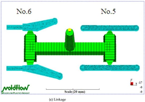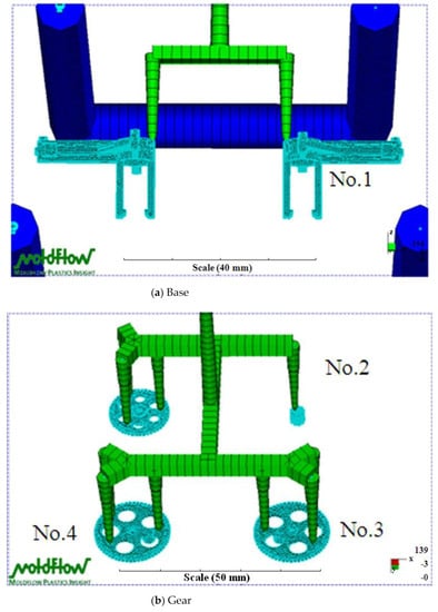 The governing equations in this study were solved by a finite element method. For details of the numerical simulations, see Chiang et al. [40]. A 3D mesh in the Moldflow analysis was used to examine the transmission parts (i.e., base, gears, and linkages) of the FW-MAV. The base parts of the FW-MAV model included 22,100 mesh elements, which were four-node tetrahedral elements, and 11,182 nodes (Figure 3a). The calculation time was about 2159 s for this case. The model had 19,402 mesh elements and 9800 nodes for the gear parts of the FW-MAV (Figure 3b). The calculation time was about 2608 s. Figure 3c shows that the linkage model of the FW-MAV had 32,056 mesh elements and 16,059 nodes. The calculation time was roughly 6029 s. Calculations were performed with Moldflow software (vers. 2009) on a PC equipped with a Pentium 6 3.5-GB CPU, 8 GB of memory, and a 1-TB hard drive.