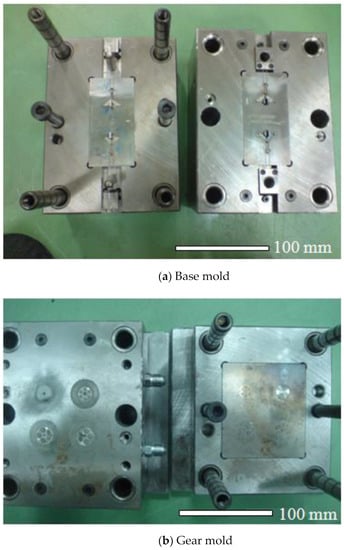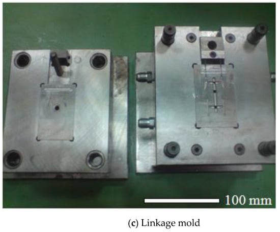 A three-plate mold was utilized during PIM. The mold material was T−20. The inlet gate of the three-plate mold had a sidewall pin gate. The mold hardness was 350 micro Vickers (HMV). Figure 4 shows the mold and cavity dimensions for the base, gear, and linkage parts of the FW-MAV. The injection molding machine (220S; Arburg Co., Ltd., Loßburg, Germany) had a screw diameter of 18 mm and clamping force of 25 tons. The mold temperature control machine was the 300S type (Regloplas, St Gallen, Switzerland), with an accuracy of ±1 °C. The transmission parts of the FW-MAV used POM (Delrin@ 900P, DuPont, Wilmington, DE, USA). Its density, tensile strength, tensile modulus, and flexural modulus were 1.42 g/cm3, 70 MPa, 3.3 GPa, and 3.0 GPa, respectively. Its distortion temperature was 162 °C. POM material is a milky-white opaque crystalline thermoplastic with a high elastic modulus, high rigidity, and high hardness, and its specific strength and specific rigidity are close to that of metal. It has strong tensile strength, high flexural strength, reverse fatigue, and good impact resistance. Its friction coefficient is small, its wear resistance is good, and its dimensional stability is good. To sum up, the POM material was selected as the transmission part’s material in this study. The objective was to obtain optimal processing for the transmission parts of the FW-MAV by PIM. PIM processing parameters were the mold temperature (A), melt temperature (B), injection pressure (C), and packing pressure (D). Table 2 indicates the levels and values of the processing parameters of PIM using POM. Due to the numerous and widely varying process parameters involved, the Taguchi [41] method was used to optimize processing conditions in order to minimize warpage of the transmission parts of the FW-MAV. Determining the relative significance of these four process parameters required an array of experiments with as many as 34 runs each. An L9 orthogonal array table was generated to determine the optimal processing conditions to produce minimum warpage during PIM.