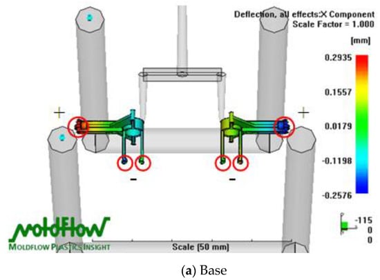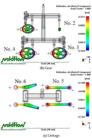 Figure 6 indicates the deflection distribution in the X-Z plane of the transmission parts of the FW-MAV in the Moldflow analysis. The deflection analytical results (Figure 6a) show that the maximum negative (−) deflection was at the base end close to the motor, whereas the maximum positive (+) deflection was at the other end of the base. The maximum warpage value was 0.2935 mm for the deflection difference of the base part. It could be seen from the results that the amount of warpage was large, so it was necessary to adjust the characteristic size of the mold insert part during the mold making process to improve the accuracy of the finished product (base). The maximum deflection was positive on the left side of the gear (Nos. 3 and 4) of the FW-MAV and negative on the right side (Figure 6b). The maximum warpage value was 0.1617 mm for the deflection difference of the gear part. The maximum warpage was mostly concentrated in the large gear and middle gear. The results showed that the warpage caused the outer diameter of the gear to shrink and create errors in the fit between the gears. The warpage caused by the uneven shrinkage of the gear could be avoided by increasing the characteristic size of the mold cavity to improve the accuracy of the finished product (gear) during the manufacture of the mold. Figure 6c reveals that the positive deflection was at its maximum on the left end of the linkage (Nos. 5 and 6), and the negative deflection was maximum on the right end of the No. 5 linkage. The maximum warpage value was 0.1389 mm for the deflection difference of the linkage part. It could also be seen from the results that the amount of warpage was large; hence, it was necessary to adjust the characteristic size of the mold insert part when making the mold to improve the accuracy of the finished product (linkage).