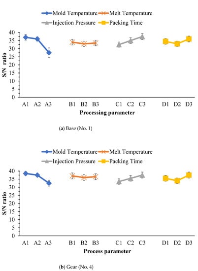Figure 7b reveals S/N ratios with factor levels for warpage of the gear parts fabricated by PIM. Levels of optimal factors for minimizing warpage were A3B2C1D2 during PIM. These levels of optimized factors were a mold temperature of 100 °C, a melt temperature of 210 °C, an injection pressure of 300 bar, and a packing time of 1.5 s. The mold temperature was the key process parameter for minimizing warpage of the gears, followed by the injection pressure, packing time, and melt temperature. From the ANOVA results, the change in the error term did not affect the integration of the factor, which was larger than the change in the error of the S/N ratio of the calculated results, indicating that the factor had an influence, otherwise it belonged to the experimental error. The table with results of the S/N ratio variance analysis of the warpage of PIM gear parts clearly shows that the variance of the mold temperature’s results was larger than those of the other three process parameters (Table 6). We integrated the factor variances of B, C, and D into the error term and obtained the pooled errors in Table 7. It could be seen from the table that the most important parameter at a 94.60% confidence level was the mold temperature. Finally, this study determined that the mold temperature was the most important process parameter for PIM for making the gear parts of an FW-MAV, based on Table 4, Table 6, Table 7 and Figure 7b.