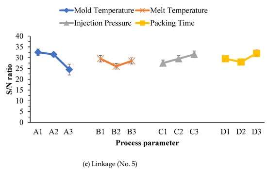 Table 5 shows the S/N ratio of warpage of the linkage part for the FW-MAV. Figure 7c indicates the S/N ratio with factor levels for warpage of the linkage part with PIM. Levels of optimum factors that were statistically likely to minimize warpage during PIM were A3B2C1D2. These optimized factors were a mold temperature of 100 °C, a melt temperature of 210 °C, an injection pressure of 300 bar, and a packing pressure of 1.5 s. The data revealed that the mold temperature was the key process parameter for minimizing warpage of the linkage part, followed by the injection pressure, packing time, and finally the melt temperature. By way of the ANOVA, transformation of the error term did not affect integration of the factor, which was larger than the transformation of the error S/N ratio of the calculated outcome, indicating that the factor had an influence, otherwise it belonged to the experimental error. The table with the results of the S/N ratio variance analysis of warpage of the linkage part in PIM clearly shows that the variance of the mold temperature’s results was larger than those of the other three process parameters (Table 6). We integrated the factor variances of B, C, and D into the error term. We obtained pooled errors in Table 7, which showed that the most important parameter at a 91.25% confidence level was the mold temperature. Finally, this study determined that the mold temperature was the most important processing parameter for PIM for making the linkage part of an FW-MAV, based on Table 5, Table 6, Table 7 and Figure 7c.