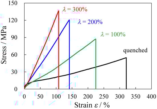 Figure 1 shows the stress–strain curves of the heat elongated TPU film obtained by elongation at 150 °C at various elongation ratios λ. The stress–strain curve of the quenched TPU film before elongation (λ = 0%) is also shown in Figure 1 for comparison. In the quenched TPU, the stress increased steeply at strain ε below 10% (ε < 10%) and then increased slightly at 20% < ε < 100%. After the slight increase in the stress, the stress upturn occurred at around ε = 100%, and the stress gradually increased from 15 to 55 MPa with the increase in ε up to the breaking point at around ε = 320%. The interesting result here is that the stress drastically increased with the increase in λ due to the heat elongation of the quenched TPU. The stress upturn started to occur at lower ε with increasing λ in the heat-elongated TUP. The stress increase at the stress upturn continuously increased with λ, although the increase in the initial increase with λ under low strain (ε < 10%) was slight. Due to the drastic change in the stress increase with λ at the stress upturn, the stress at break of the quenched TPU film increased from 55 to 136 MPa following heat elongation at λ = 300%, i.e., the enhancement of the stress by the heat elongation was about 2.5 times.