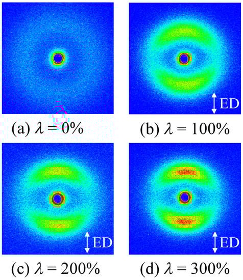 Figure 2 shows the two-dimensional (2D) SAXS patterns of the elongated TPU films at various elongation ratios λ. A weak isotropic ring pattern was observed in the quenched TPU film (λ = 0%), indicating that the microphase-separated structure at a nanometer scale consisting of a hard segment (HS) and soft segment (SS) is regularly arranged at a periodic distance (Figure 2a). Following elongation at λ = 100%, the isotropic ring pattern changed to a curved-layer one (Figure 2b). According to the Metropolis Monte Carlo simulation for an SAXS pattern using a small-particle aggregation model, the curved-layer pattern is attributed to the stack of an anisotropically shaped domain structure [50]. Thus, the appearance of the curved-layer pattern indicates that the macroscopically arranged stacked domain structure consisting of anisotropically shaped domains is formed by the heat elongation, and the longer direction of the HS domains is arranged perpendicular to the elongated direction (ED). The curved-layer patterns were maintained despite the further elongation and the scattering intensity increased with the increasing λ (Figure 2c,d). This stacked domain structure might be similar to the mille-feuille structure consisting of alternatively stacked crystalline layer and the amorphous one suggested by the layer-shaped SAXS pattern observed in the heat-elongated HDPE film, which exhibited strengthening [48].