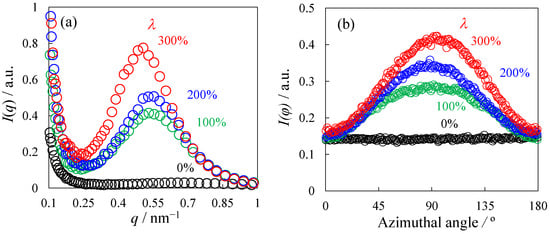 Figure 3 shows the one-dimensional (1D) SAXS profiles of the heat-elongated TPU films derived from the 2D SAXS patterns shown in Figure 2. The SAXS profile I(q) shown in Figure 3a was obtained at the azimuthal angle of −10–10° of the SAXS patterns in Figure 2, where 0° is the meridional direction, and the q is the scattering vector defined as q = 4π/λ0 sin θ, where λ0 is the wavelength of X-ray and θ is the scattering angle. A single peak was seen at the qmax in the I(q) in the quenched TPU film (λ = 0%), indicating that HS domains and SS ones are periodically stacked, i.e., the most probable next-neighbor distance of the HS domains in the elongated direction obtained by 2π/qmax was 8.8 nm. The peak position shifted slightly to a lower q with the increasing elongation ratio λ at λ > 100%, in which the layer pattern was observed, indicating that the change in the next-neighbor distance of the HS domains in the stacked structure was slight with λ, i.e., the next-neighbor distances obtained by 2π/qmax at λ = 100% and 300% were 11.3 nm and 11.9 nm, respectively. The peak intensity in the I(q) became stronger with λ (Figure 3a). The increase in peak intensity might be attributed to the increase in densification in the HS domains and crystallinity. The peak became sharper through association with the increased peak intensity, indicating that the periodicity of the HS domains in the stacked structure increases with λ. The peak profile for the azimuthal angle ϕ dependence of the scattering intensity I(ϕ) became sharper, and the peak intensity became stronger with the increasing λ (Figure 3b), indicating that the orientation degree of the HS domains increases with increasing λ according to the macroscopically arranged stacked domain structure.