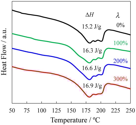 The DSC curves at the endothermic peak, which are needed to melt the heat-elongated TPU films, are shown in Figure 4. The heat of fusion ΔH obtained by the peak area is shown in Figure 4. The change in ΔH was slight with an elongation ratio of λ, suggesting that the change in crystallinity was slight with λ, although the SAXS intensity increased, as shown in Figure 3a. Thus, the increase in the SAXS peak intensity shown in Figure 3a is not attributed to the increase in the crystallinity, but to the densification of the HS domains in the stacked structure.