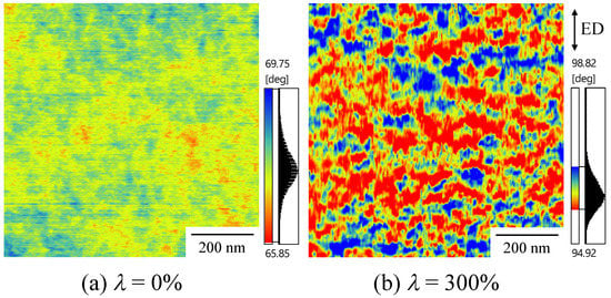 Figure 5 shows the AFM phase image of the quenched TPU film (λ = 0%) and the heat-elongated one (λ = 300%). Here, the color depth was normalized by the phase difference, and the phase difference is ascribed to the hardness difference between the HS and SS phase. The hard region is indicated by red and green, while the soft region is indicated by blue. Connected HS domains were dispersed in the SS matrix in the quenched TPU (Figure 5a). In the elongated TPU, a stacked domain structure consisting of anisotropically shaped HS domains with a next-neighbor distance of tens of nanometers were seen, and a longer direction was arranged for anisotropically shaped HS domains perpendicular to the elongated direction (ED) (Figure 5b). These results support the macroscopically arranged stacked domain structure and arrangement of the anisotropically shaped HS domains perpendicular to the ED, as suggested by the SAXS patterns shown in Figure 2b–d. The next-neighbor distances in the elongated direction, estimated by AFM observation and SAXS measurements, had the same order, but did not exactly match due to the inclination of the crystallites [51]. The interesting result here is that the difference in hardness between the HS and SS phase drastically increased following the heat elongation of the quenched TPU. The increase in the hardness difference caused by heat elongation was attributed to the increase in the density difference due to the densification of the HS domains suggested by the increase in the SAXS intensity with λ, as shown in Figure 3a.