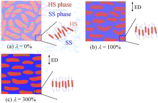 Figure 6 shows the schematic illustration of the TPU film during heat elongation at 150 °C. The regularly arranged microphase-separated structure of HS and SS domains in the quenched film (λ = 0%) are macroscopically arranged into a stacked domain structure consisting of the anisotropically shaped HS domains caused by heat elongation, and the longer direction of the HS domains are arranged perpendicular to the elongated direction (ED) (Figure 6a,b). The densification of the HS domain increases without a significant increase in the crystallinity during heat elongation (Figure 6c). The densification is ascribed to the ordering and packing of the HS chains, as suggested in references [23,24,25,26,27]. Since the densification in the HS layers increases with λ, the TPU strengthening shown in Figure 1 might be attributed to the existence of the macroscopically arranged stacked domain structure and the increase in the densification of the HS domains in the stacked structure.