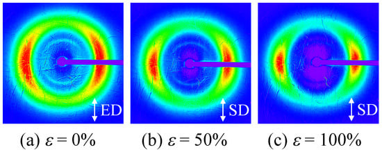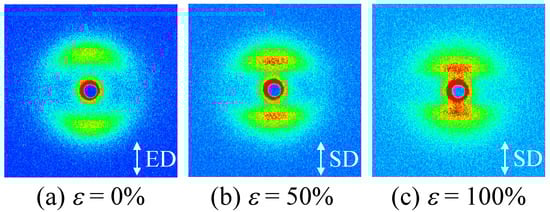 Two-dimensional SAXS patterns of the heat-elongated TPU film (λ = 300%) during uniaxial stretching at various strains ε at 23 °C; (a) ε = 0%, (b) ε = 50%, (c) ε = 100%. ED is elongated direction and SD is stretching direction.
