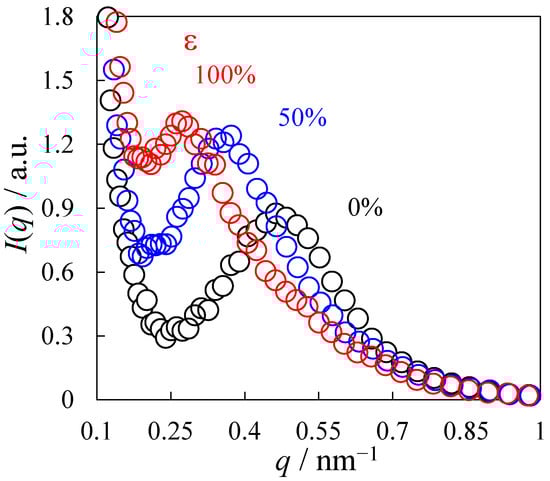 The 1D SAXS profile in the stretching direction of the SAXS patterns of Figure 7a–c is shown in Figure 8 for various strains ε. Here, the SAXS profile I(q) was obtained at the azimuthal angle of −10–10° of the SAXS pattern, where 0° is the meridional direction. A single peak was seen, indicating that the HS and SS domains are periodically stacked. The peak was shifted to a lower q during the stretching, indicating that the most probable next-neighbor distance of the HS domain in the stacked structure increased during the stretching, i.e., the next-neighbor distance obtained by 2π/qmax increased from 12.4 nm at ε = 0% to 22.0 nm at ε = 100%. The peak became sharper, and the peak intensity increased with increasing ε. These results suggest that the stacked structure remains during the deformation at the stress upturn by preventing the fracture of the HS domains.