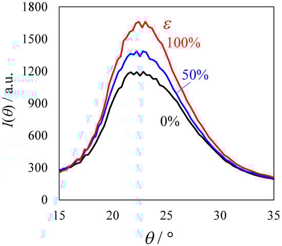 Figure 9 shows the 2D WAXD pattern of the elongated TPU film (λ = 300%) during stretching at 23 °C at various strains of ε. The spot pattern caused by strain-induced crystallization was not observed, but a broad, arc-shaped pattern was observed during the stretching up to breaking point. The arc-shaped pattern at ε = 0% became narrower with ε at the stress upturn, indicating that the crystalline HS chains are oriented with ε at the stress upturn by associating with the ordering of the HS domains in the stack structure. The increase in the sharpness of the 1D WAXD profile derived from Figure 9 was slight with ε at the stress upturn (Figure 10). Here, the 1D profile I(θ) shown in Figure 10 was obtained at the azimuthal angle of 80–100° of the WAXD patterns in Figure 9, where 0° is the meridional direction. These results indicate that strain-induced crystallization was not observed in the heat-elongated TPU at the stress upturn, although stress upturn is attributed to the strain-induced crystallization [31,32,33,34,35].