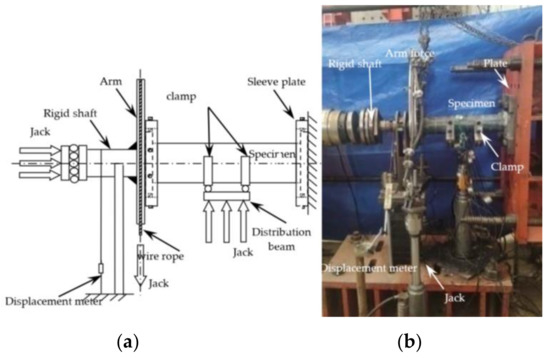 The test was completed in the Structural Engineering Laboratory of Shenyang Architecture University. A jack, a load distribution beam and a clamp were added to the specimen to apply the bending moment. A concentrated force with equal values and the same direction is applied to one-third of both sides of the specimen through the distribution beam to achieve the effect of applying the bending moment. The loading equipment and its schematic diagram are shown in Figure 2.
