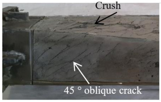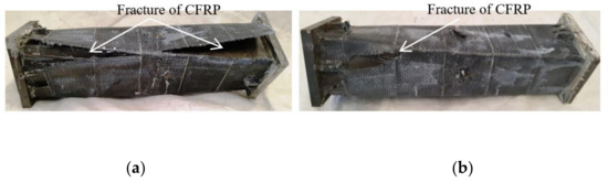 The CFRP failure mode, steel tube failure mode and concrete failure mode of the square section specimen are shown in Figure 3, Figure 4 and Figure 5, respectively. A transverse and longitudinal CFRP fracture can be seen in the bending area of the specimen with a small moment ratio; the fracture develops from the end of the specimen to the middle of the specimen. For the specimens with a large moment ratio, the cracking degree of CFRP is light because the bending moment is large and has a certain restraint effect on the members. It can be seen that the steel tube is not cracked, and the specimen has obvious torsional deformation after loading. A large number of 45° inclined cracks appear in the concrete, and some concrete in the flat area is crushed, which indicates that the steel tube and concrete are mainly subjected to torsional damage. Figure 6 shows all specimens after the flexural-torsional test.