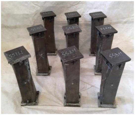 - Al-Mekhlafi, G.M.; Al-Osta, M.A.; Sharif, A.M. Behavior of eccentrically loaded concrete-filled stainless steel tubular stub columns confined by CFRP composites. Eng. Struct. 2020, 205, 110113. [Google Scholar] [CrossRef]