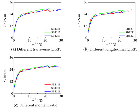 Figure 20 and Figure 21 show the influence of the number of longitudinal CFRP layers and transverse CFRP layers on the T-θ curve of concrete-filled CFRP steel tubular flexural torsional performance members, respectively. It can be seen that with the increase in the number of CFRP layers, the curve shape and initial stiffness do not change significantly, and the bearing capacity of members increases slightly. This is because with the increase in the number of CFRP layers, the ability of members to be restrained is improved, and the macroscopic performance is that the bearing capacity of members increases, which is also consistent with the test results.