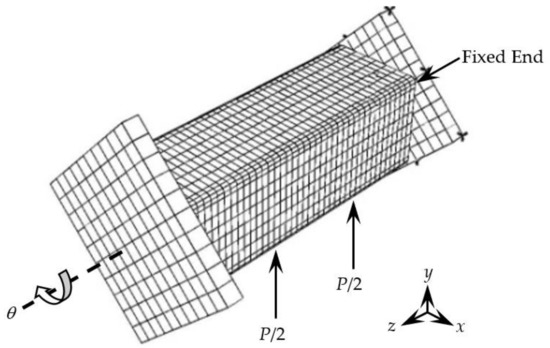 The stress–strain relationship of the steel tube and concrete used in the finite element simulation of concrete-filled CFRP steel tube bending torsion member is suggested by Han [15]. The stress–strain relationship of CFRP is suggested by references [14,15,16,17]. When the strain of the transverse CFRP reaches its fracture strain εcftr (3000 µε) or the strain of longitudinal CFRP reaches its fracture strain εcflr (3000 µε), the transverse restraint effect or longitudinal reinforcement effect on the steel pipe will be lost, respectively. Figure 8 shows the boundary conditions of the finite element simulation of square CFRP concrete-filled steel tubular flexural torsional members. One side is used as the fixed end to restrict the displacement and rotation angle in x, y and z directions. The bending moment is converted into two concentrated forces according to the bending moment ratio and applied to the middle of the lower span of the member. The other side is used as the loading end to apply the angle.
