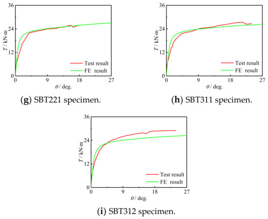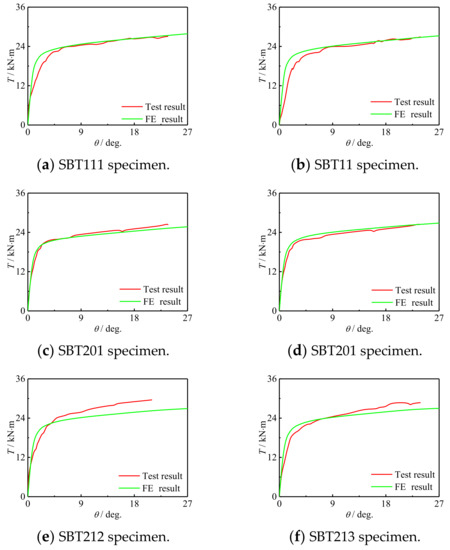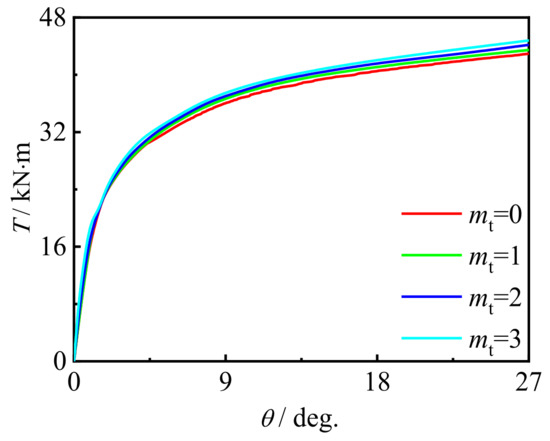 Figure 9 shows the comparison of the T-θ curve between the simulation results and the test results. It can be seen that the early stiffness and ultimate bearing capacity of the curve established by the finite element model are in good agreement with the test. It can be inferred that the simulation results are in good agreement with the T-θ curve of the test results.