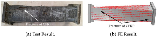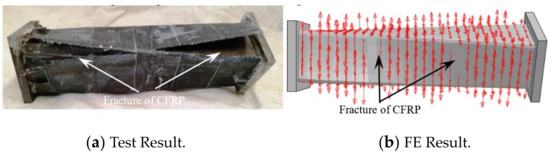 Figure 11 shows the failure mode of longitudinal CFRP of a square CFRP concrete-filled steel tubular flexural torsional performance specimen (the arrow in the figure indicates the longitudinal CFRP that has not been broken). As can be seen in Figure 11, the finite element mode shows that the longitudinal CFRP cracks from the upper and lower ends to the middle, respectively, indicating that the finite element results are in good agreement with the test results.