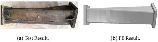 Figure 12 shows the failure mode of a square CFRP concrete-filled steel tubular flexural torsional performance specimen. It can be seen from Figure 12 that the failure mode of steel pipe simulated by finite element is basically consistent with that of the test. From the test and simulation results, it can be seen that the steel pipe is mainly subjected to torsional failure.
