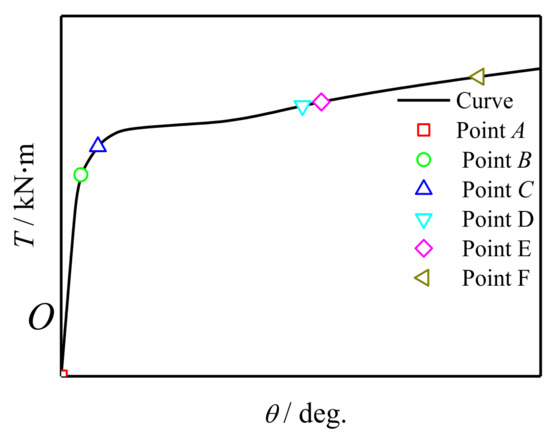 Figure 14 shows the typical T-θ curve of concrete-filled CFRP steel tubular flexural torsional members. A total of six feature points are selected for the curve: point O corresponds to the point after the bending moment and before the torque is applied, point A corresponds to concrete cracking, point B corresponds to the steel reaching yield strength and point C corresponds to the transverse CFRP fracture, point D corresponds to the longitudinal CFRP fracture. The corresponding component at point E reaches a 15° angle.
