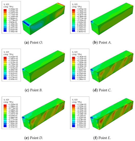 Figure 15 shows the shear stress distribution of concrete in a square concrete-filled CFRP steel tubular flexural torsional members. It can be seen that the shear stress of the square members is roughly antisymmetric along the length direction. During the whole loading process, the maximum shear stress is always at the end of the concrete.
