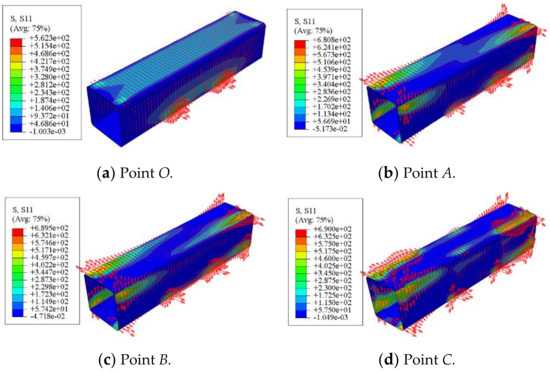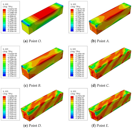 Figure 16 shows the longitudinal stress distribution of concrete in a square concrete-filled CFRP steel tubular flexural torsional members. It can be seen that at points O~B, the longitudinal stress of concrete is symmetrically distributed left and right along the length direction. In the subsequent loading process, the longitudinal stress of the square member is basically distributed in the 45° direction along the length direction, which shows that from the whole process analysis, the concrete inside the member is mainly affected by torsional deformation.
