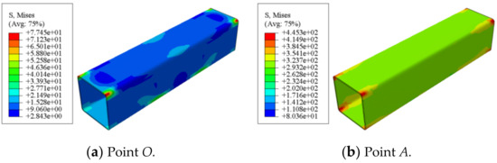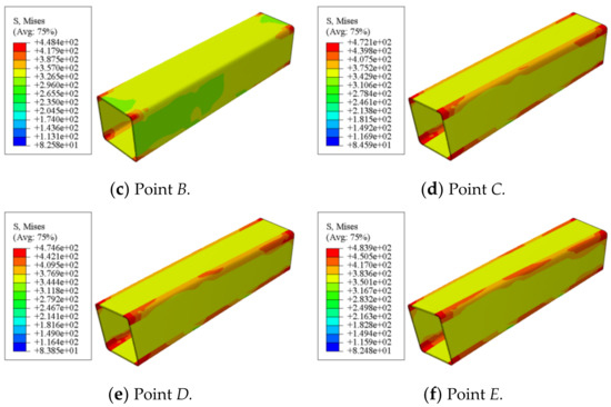 Figure 17 shows the Mises stress distribution of square concrete-filled CFRP steel tubular flexural torsional member. It can be seen that at point A, the steel is still in the elastic stage, the stress is still very small, and the stress at the steel plate of the component is smaller than that at the corner. When the steel is loaded to point C, the steel is elastic to yield, the stress of the steel pipe increases greatly, the steel plate of the component begins to yield and the maximum stress appears at the corner. After point C, the steel pipe gradually strengthened and the stress continued to increase. In the whole loading process, the maximum Mises stress of the square member is always concentrated at the corner due to the stress concentration.