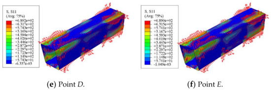 The longitudinal stress distribution of the concrete-filled CFRP steel tubular flexural torsional member is shown in Figure 19. At point O, the member deformation is small and the longitudinal CFRP stress is also small. With the progress of loading, the longitudinal CFRP stress increases gradually. When the member is loaded to point D, when the longitudinal CFRP stress at the corner reaches 690 MPa, the CFRP begins to fracture and is also mainly concentrated at the corner.