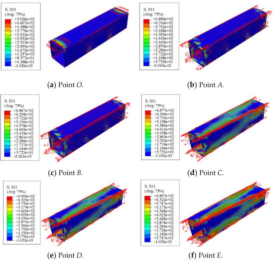 Figure 18 shows the transverse CFRP stress distribution of square concrete-filled CFRP steel tubular flexural torsional members. It can be seen that at point O, the member deformation is very small and the transverse CFRP stress is also very small. With the application of torque, the stress of transverse CFRP increases gradually in the process of loading to point A and even point B. When loaded to point C, the transverse CFRP stress near the corner of the steel pipe reaches 690 MPa and begins to fracture. After that, the transverse CFRP fracture area of the square member increases gradually from the middle section to the end plate and from the corner to the midpoint of the plate, which shows that the transverse CFRP plays a good role in restraining the member.