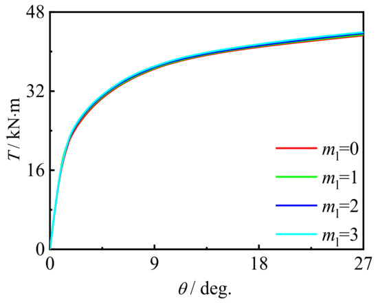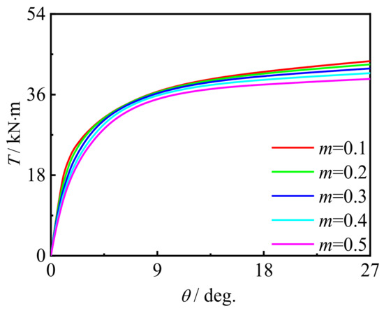 Figure 24 shows the effect of the moment ratio on T-θ curve of concrete-filled CFRP steel tubular flexural torsional member. It can be seen that with the increase in the moment ratio, the curve shape and initial stiffness do not change significantly, and the bearing capacity of members decreases slightly. This is because with the increase in the moment ratio, the damage increases, resulting in the reduction in the bearing capacity of the member.