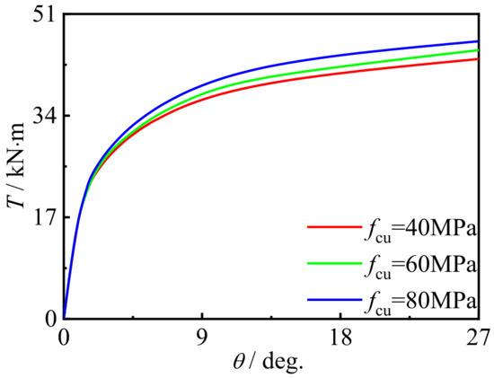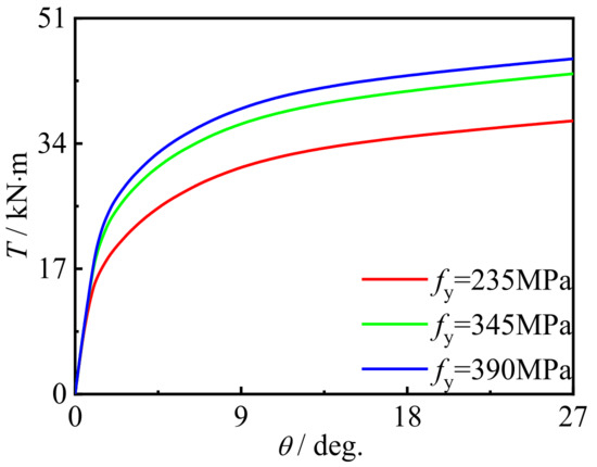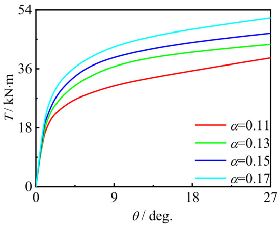 Figure 25 shows the effect of steel ratio on the T-θ curve of concrete-filled CFRP steel tubular flexural torsional member. It can be seen that with the increase in the steel ratio, the early stiffness and member bearing capacity are significantly improved. This is because, with the increase in the steel ratio, the brittleness and strength of steel are significantly improved, which leads to the increase in the early stiffness and maximum bearing capacity of members.