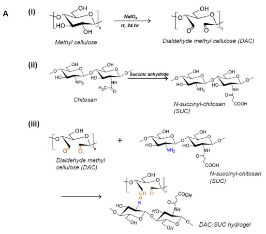 Methyl cellulose was oxidized by sodium periodate to create aldehyde functional groups (dialdehyde methyl cellulose; DAC), and succinyl-chitosan (SUC) was synthesized with succinic anhydride. Therefore, the in situ forming DAC-SUC hydrogel could be prepared by simply mixing DAC and SUC two solution together. Figure 1A showed the functional group created reactions and the hydrogel formed chemical reaction.