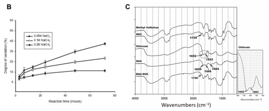 Cellulose is a linear homopolymer of D-glucose units with β (1→4) linkage, and methyl cellulose is the simplest cellulose derivative. The methyl groups (–CH3) may substitute the hydroxyls at C2, C3 or C6 positions to improve its water solubility [9]. It has been used in medical related studies, such as constipation treatment and artificial tears [10]. Recently, some research extended its use to cartilage regeneration due to its high strength in the wet state, biocompatibility as well as relatively simple, cost-efficient production [11,12,13]. Various types of cellulose-based scaffold were developed for chondrogenesis enhancement, such as membrane [14], double network [15], oxidation [16] and electrospinning [17]. Chitosan is composed of glucosamine and N-acetylglucosamine and has a similar structure to some articular cartilage components [18,19]. It has limited solubility in physiological solvents because of the strong intermolecular hydrogen bonding. To improve its solubility, we introduced succinyl groups at the N-position of the glucosamine units to synthesize N-succinyl-chitosan (SUC). In the study, we created dialdehyde functional group on methyl cellulose (DAC) at C2 and C3 position by oxidation process, mixed with amine group rich molecular-N-succinyl-chitosan (SUC) to form an in situ forming DAC-SUC hydrogel without other crosslinking reagents.