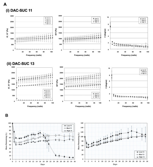 Figure 2. Rheological properties and mass remaining of the DAC-SUC hydrogel. (A) Rheological characterization of (i) DAC-SUC 11 and (ii) DAC-SUC 13 hydrogel (frequency sweep) shown as the storage modulus (G’), loss modulus (G”), complex modulus |G*| and tangent of the phase angle (δ). The storage modulus G′ was increased with oxidation rate of DAC increase. (B) Mass remaining of DAC-SUC hydrogels. The weight loss of hydrogel was recorded for 35 days and DAC-SUC13 hydrogel could exist over 35 days.