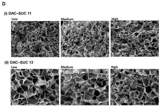 Figure 3D showed cross-section SEM images of DAC-SUC hydrogel, and it characterized the microstructure morphologies. The hydrogels displayed a continuous and porous structure. The pore size of DAC-SUC13 hydrogels were larger than that of DAC-SUC11.