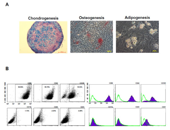 Figure 4. Characterization of pMSCs by tri-lineage differentiation and surface markers. (A) Representative images of in vitro tri-lineage differentiation potential of porcine bone marrow MSC (BM-pMSC) toward chondrogenic, osteogenic, and adipogenic lineages confirmed by histochemical staining with Alizarin red, Oil red O, and Alcian blue staining, respectively. BM-pMSCs exhibited multi-differentiation capacity of adipogenesis, osteogenesis, and chondrogenesis. (B) Representative results of flow cytometric analysis for cell surface markers using freshly isolated BM-pMSC from porcine. The population is positive for previously described MSC markers (CD90, CD44, and CD105) and negative for CD11b, CD45 and CD31 expressions from passages p5.