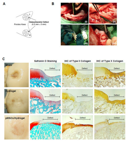 Figure 5. pMSC-hydrogel-implants enhance cartilage regeneration in the large-animal OCD model. (A) The OCD animal model in porcine. (B) The surgical procedure of the OCD regeneration in porcine. (i) The OCD were generated using an electric drill in femoral patellar groove; (ii) a 6.5 mm × 5 mm area of OCD was obtained; (iii) the pMSC-hydrogel-scaffold was implanted into OCD; and (iv) the patella was relocated and sutured the wound in layers. (C) Microscopic appearance and histological stained sections of the repaired sites in situ gelation at 6 months post-implantation. Macroscopic view of operated femoral condyle with pMSC in hydrogel implants. After paraffin-embedded and microsection, staining the sections by Safranin O, type II collagen and type X collagen.