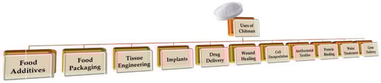 Chitosan is considered a natural biopolymer; it has received remarkable attention from the scientific community due to the fact that it can be easily biodegraded. Its residues are not toxic and can be easily eliminated and biodegraded by nature [7]. One of the most important problems associated with the raw materials is that these are limited, but chitosan is the most abundant biopolymer after cellulose. Furthermore, chitosan exhibits a great biocompatibility, limited by its low solubility which can be solved through chemical modifications and hydrolysis. Chitosan is a bioactive material which can be modulated and used in many applications [56]. Some of these applications are associated with biomedical purposes such as drug delivery systems, scaffolds, or membranes. Nevertheless, there are other important uses such as in the textile industry, wastewater treatments, agriculture, food, packaging, personal care, and biotechnology, among others. The adsorbent properties of chitosan are very useful for removing different heavy metal ions accumulated in water and derived from industrial processes such as Pb2+, Hg2+, and Cu2+, among others [57]. These can be accumulated inside the body and produce numerous diseases [58]. Chitosan can contribute to the agriculture by improving the harvest and productivity, being an ecofriendly material. It is used as a coating for seeds, enhancing the properties of the plants and the obtained products in terms of shelf life. This use as fertilizer is especially useful for plant protection as it can stimulate the plant defense, but it can also act as an antibacterial and antimicrobial agent [59]. Thus, chitosan acts as a plant growth-promoting agent and plant protector [60]. For that reason, it is considered a pesticide by several countries. The antioxidant properties of chitosan, together with its antimicrobial features, are suitable for the production of films for food packaging. The preparation of hybrid materials with chitosan allows modifying the permeability of those films depending on the requirements [2]. The chitosan can also be used as a food additive, dietary fiber, and functional ingredient [61,62].